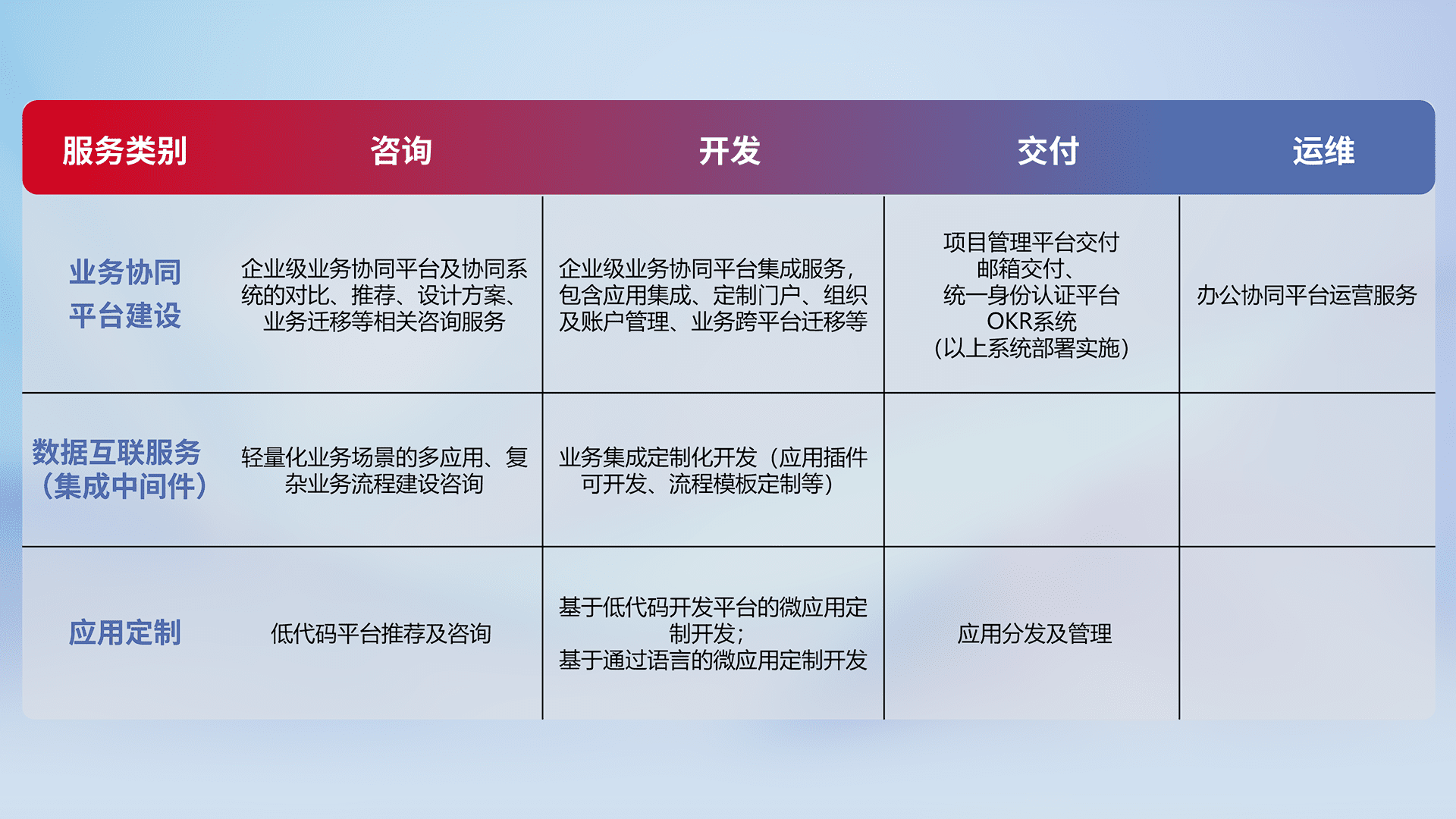 针对钉钉、、、企微、、、、IDaas等平台级产品提供产品的规划、、、方案、、、、交付、、、定制化开发等服务,,实现如统一协同办公、、、、智能客户服务、、、、混合会议管理、、、、智能数据查询、、、等业务场景,,实现数字化转型。。