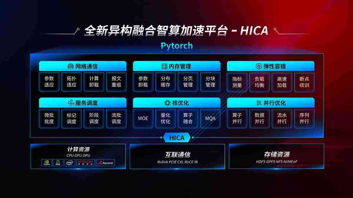 通过自研的服务层、、中间适配层、、、以及调度编排算法,,,采用数据并行、、、模型并行等多种并行方式,,把并行计算任务进行有效的分解,,,使其分别由相应的软件栈和算力资源来承接。。当GPU资源变化,,,,HICA可以实时动态调度计算子任务并调整模型拓扑和架构,,,,以充分聚合各种算力资源。。