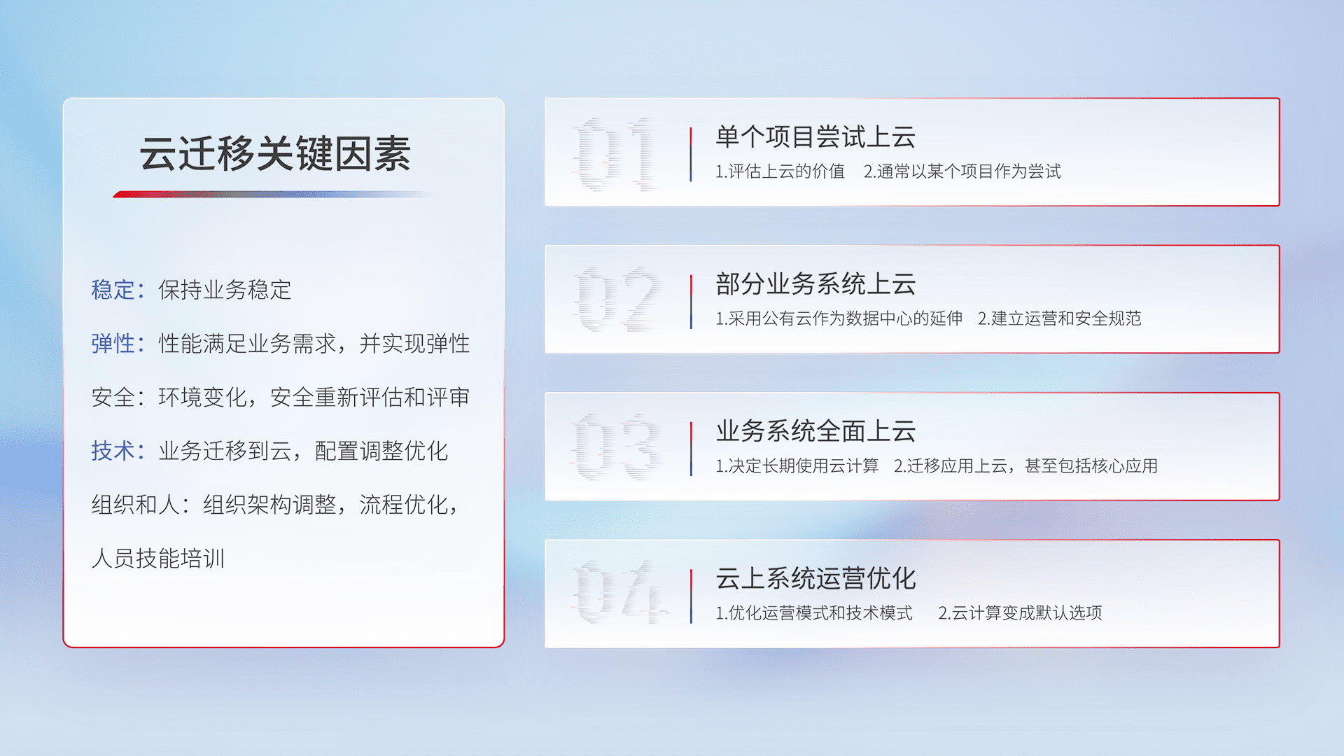 结合实际业务,,,从规划设计、、云平台选型、、云原生改造、、、数据迁移、、集成交付,,迁移全过程为客户识别最佳上云路径,,,做好风险识别管理,,,设计网络架构、、、身份权限、、、、安全审计合规、、、操作审计、、、、日志审计、、、、监控告警策略、、、多站点容灾设计等,,对云上基础设施进行整体规划,,,提升IT治理水平,,,以满足弹性、、、高可用、、、、高性能的需求。。。。